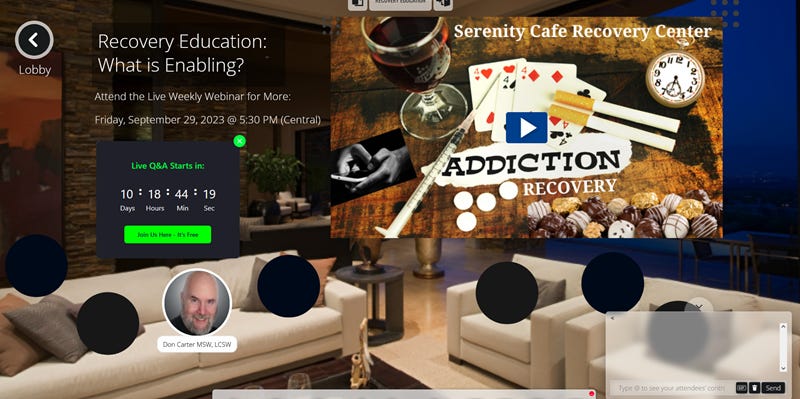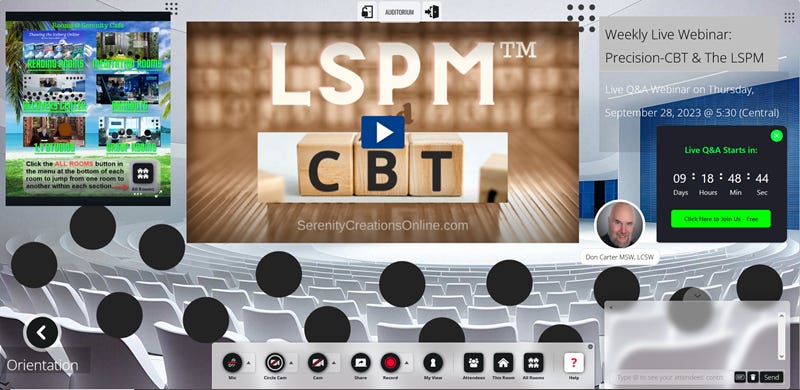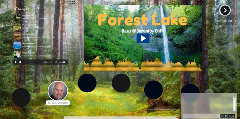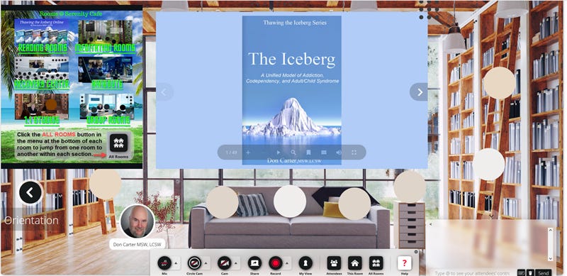 Below is a screenshot of the Serenity Cafe Homepage. It is the jumping-off point when you first enter the rooms. This is also part of the Serenity Cafe Convention Center because we can use it for workshops, live webinars, Q&A Sessions, etc.