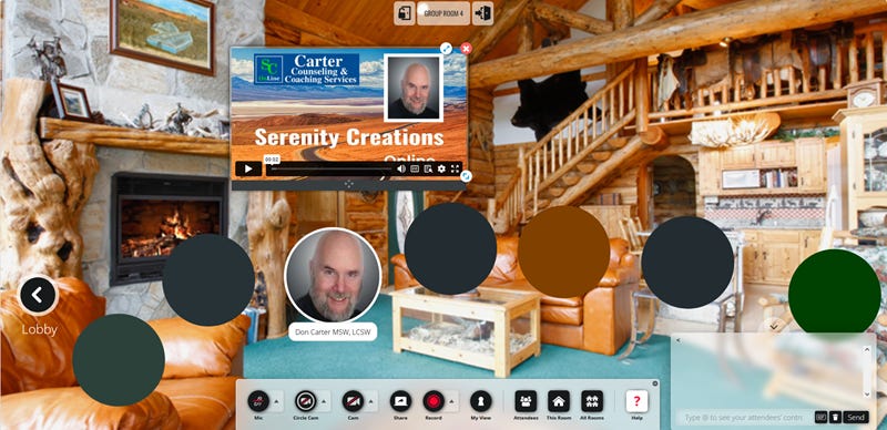 I intend to use these rooms frequently with webinars, one-to-one coaching sessions, small group sessions, online workshops, and more. Watch the video at the top of this page for an orientation, then click the link below to explore each room. The Rooms are incredibly easy and user-friendly.