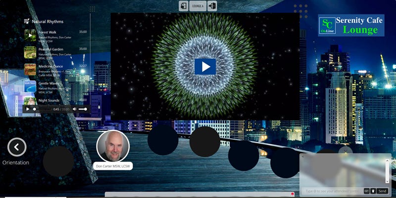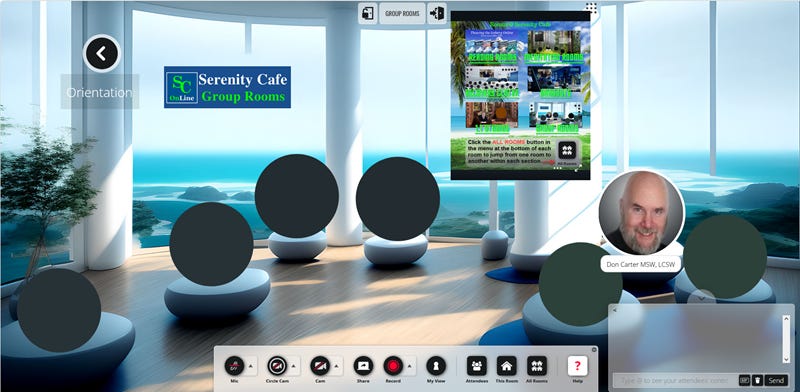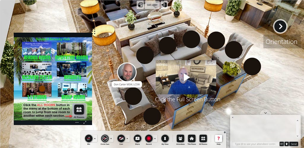 Use an avatar and a screen name or upload and use your picture and name. On the inside, you can use the circle cam or a pop-out video camera when and if you choose. Explore all of the Rooms @ Serenity Cafe: